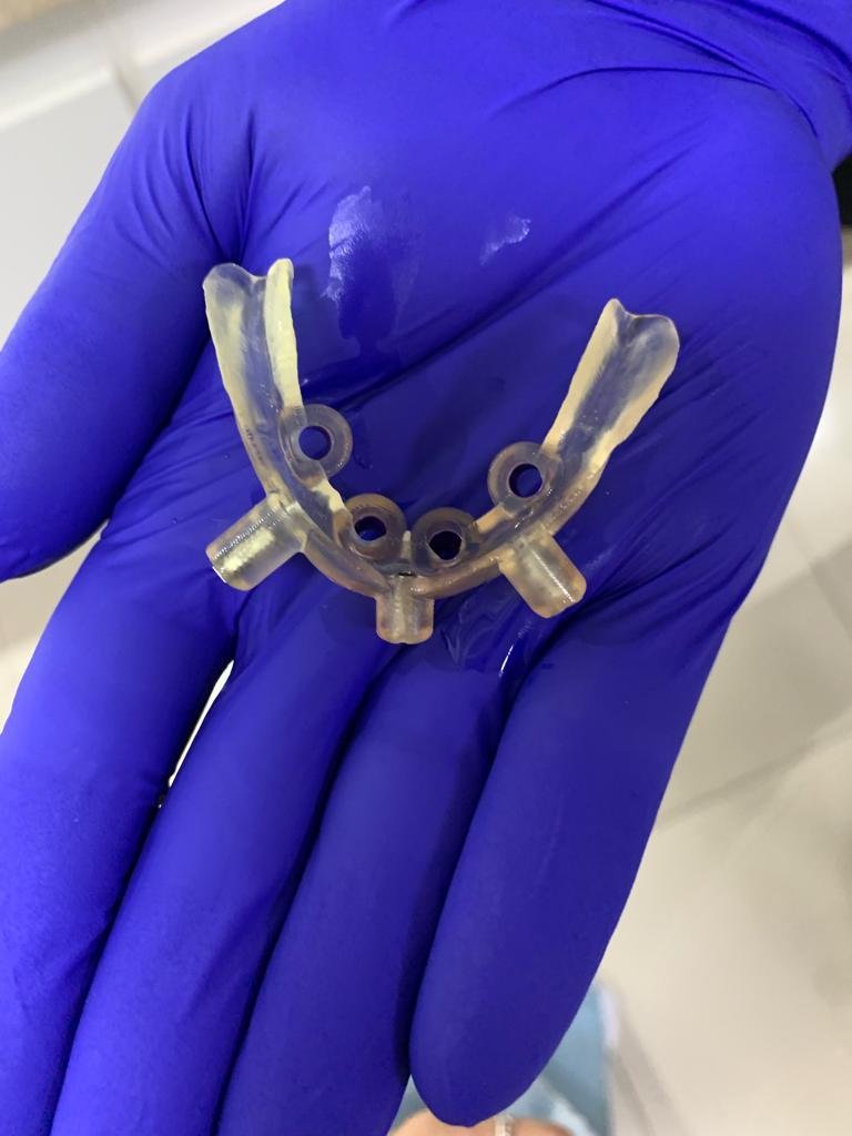 O implante em si é um pino de titânio inserido no osso do paciente. Ele funciona como uma raiz artificial que sustentará a prótese dentária. Não há risco de rejeição, uma vez que o titânio é um material inerte ao nosso organismo.